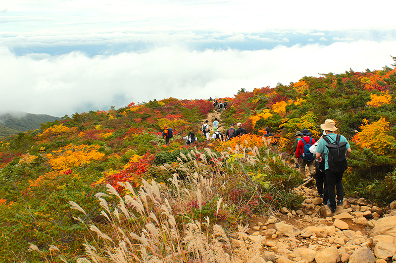 色づきはじめた山肌と雲海を眺めながら、安達太良山の頂上を目指す