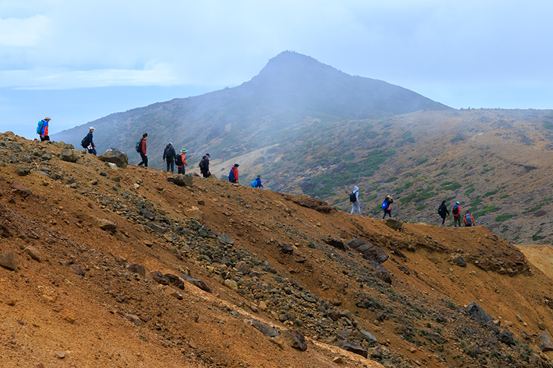 安達太良山は高山植物や紅葉の名所としても知られ、春から秋までたくさんの登山客で賑わいます。登山口が多く、初級から上級まで楽しめるのが魅力です。今回は、標高940メートルの奥岳登山口でロープウェイに乗り、標高約1350メートルの山頂駅から安達太良山の山頂を目指す初心者向けのコースです。一瀬さんのリードで登山スタート。整備された木道やごろごろと岩が転がる登山道を歩き続けると、小雨まじりの雲を超え、眼下には雲海が広がり始めました。山肌には色づき始めた木々が映え、参加者は各々スマホで撮影していました。山頂駅からのんびり登ること約1時間半、山頂の直下に到着しました。さらに参加全員で、ここから15分ほどの沼ノ平火口の展望地に足を延ばすことに。