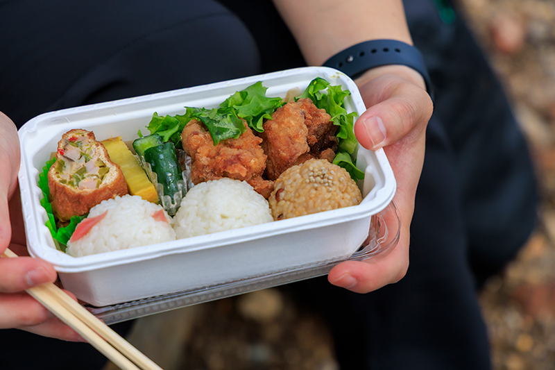 河崎大智さんと中川琴さんは「おむすびはもちろん、三五八漬けのきゅうりも美味しいし、トマトも新鮮で甘い」とお弁当に大満足!