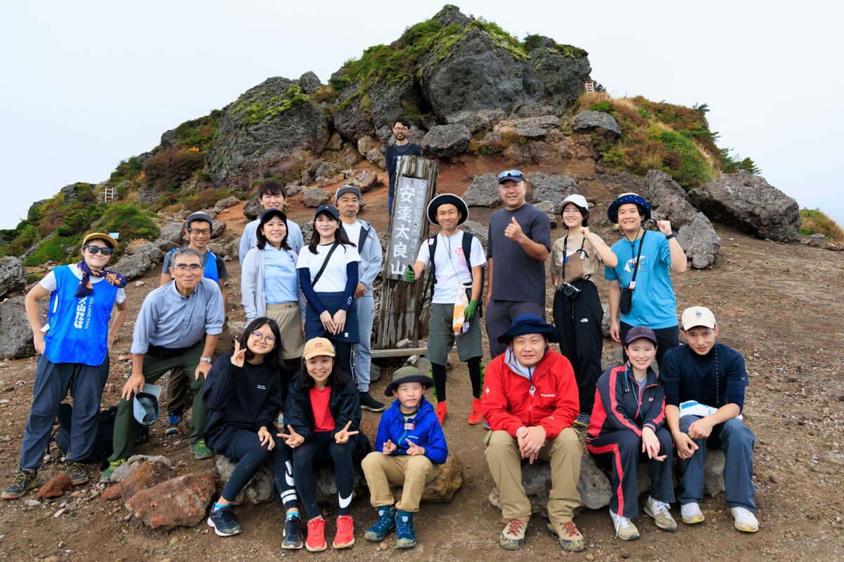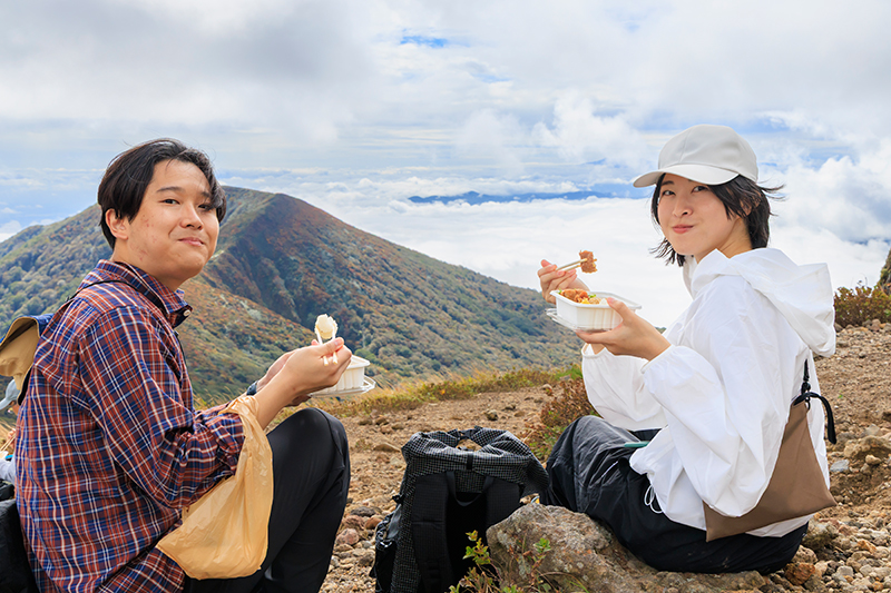 山頂下に戻り、お待ちかねの「おむすび弁当」の昼食。さわやなか秋風の中、安達太良山登山でその恵みである「大玉村の幸」は格別の味! その後、参加者全員、山頂を踏みました。山から望む大玉村は雲がかかっていましたが、安達太良山の自然や、それによってもたらされた水が、大玉村の豊かな農作物に大きく寄与しているのだと実感できたツアーでした。